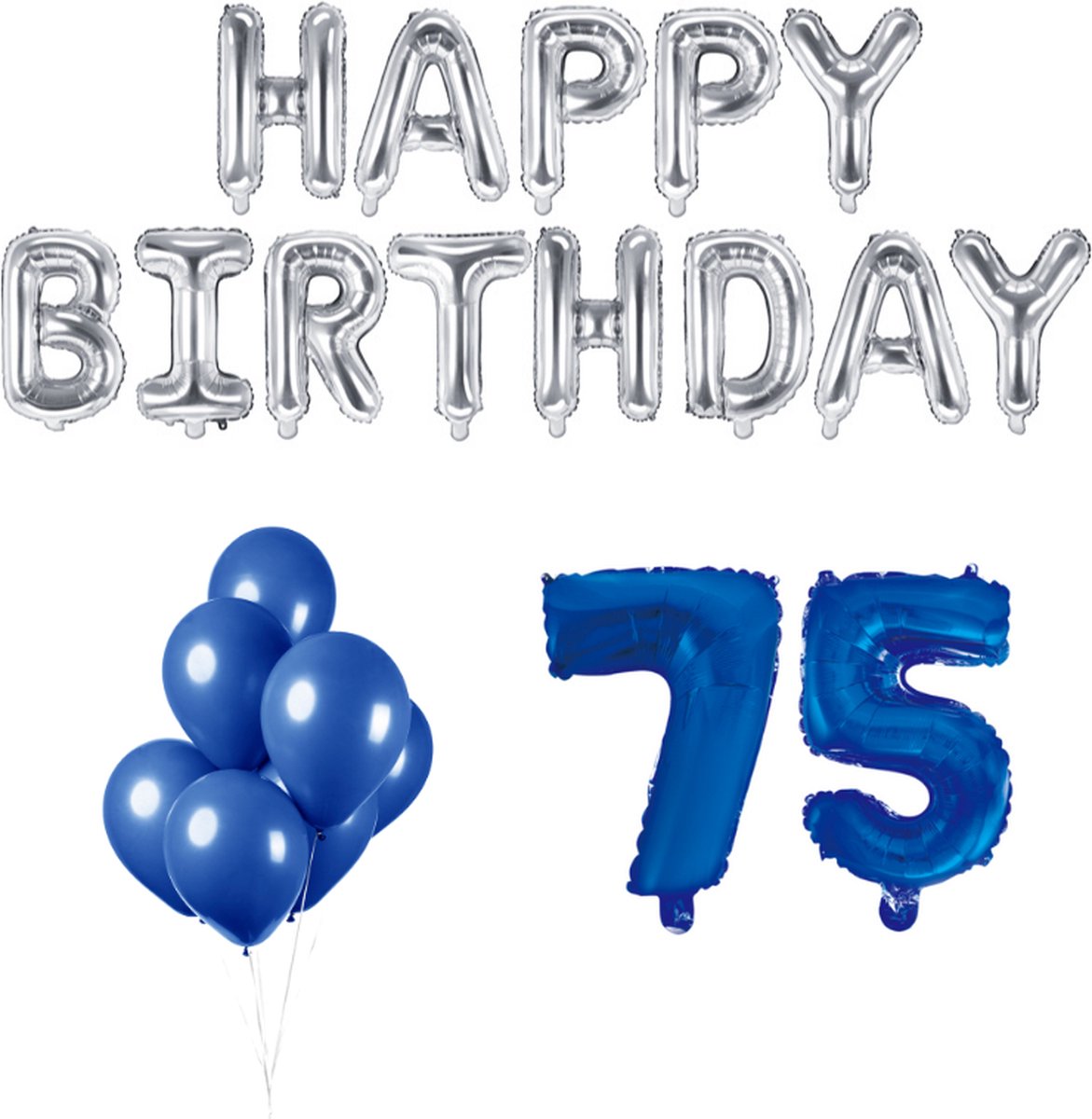 In de verpakking ontvang je cijferballonnen 75 (86cm), 10 Blauwe metallic ballonnen, Zilver gekleurde Happy Birthday letter ballonnen (340x35cm) en blauw lint van 20 meter.