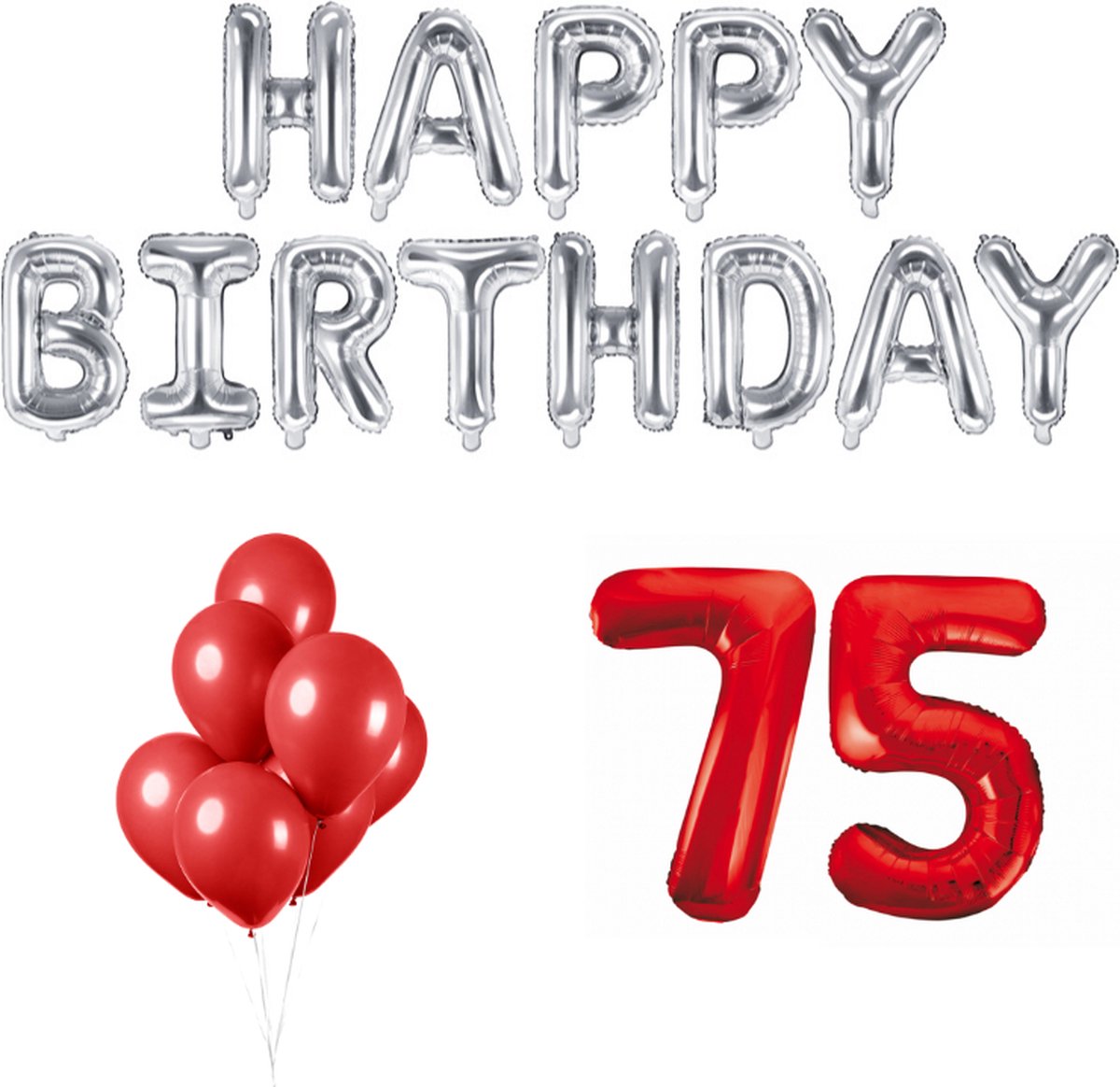 In de verpakking ontvang je cijferballonnen 75 (86cm), 10 Rode ballonnen, Zilver gekleurde Happy Birthday letter ballonnen (340x35cm) en Rood lint van 20 meter.