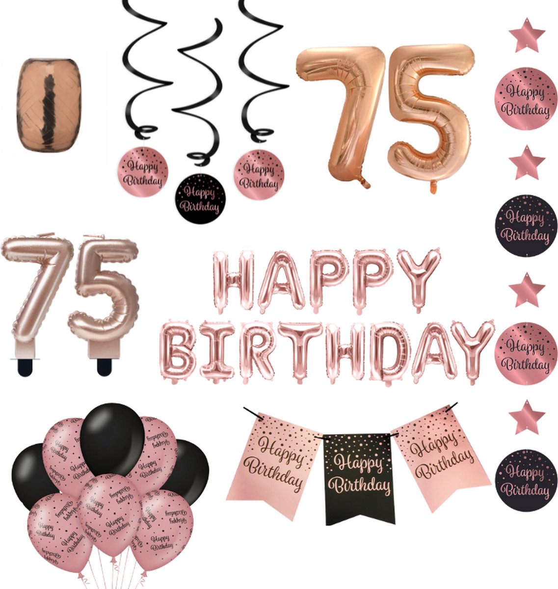 75 jaar Verjaardag Versiering pakket rose gold. Vier je de verjaardag voor iemand die 75 jaar wordt? Met dit verjaardag versiering pakket versier je de verjaardag op een super mooie manier. In de verpakking ontvang je: Happy Birthday folieballon, cijferballon (41cm), lint, 3 Swirl decoraties, Hang decoratie, vlaggenlijn, cijferkaarsen en verjaardag ballonnen.