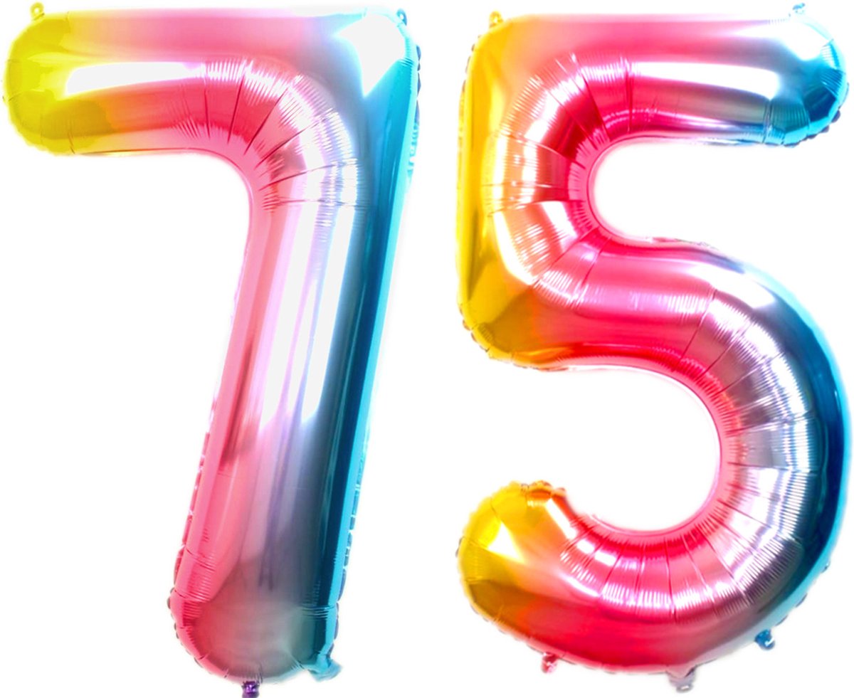 · Gigantische folieballon Cijfer 75, in de kleur Regenboog.