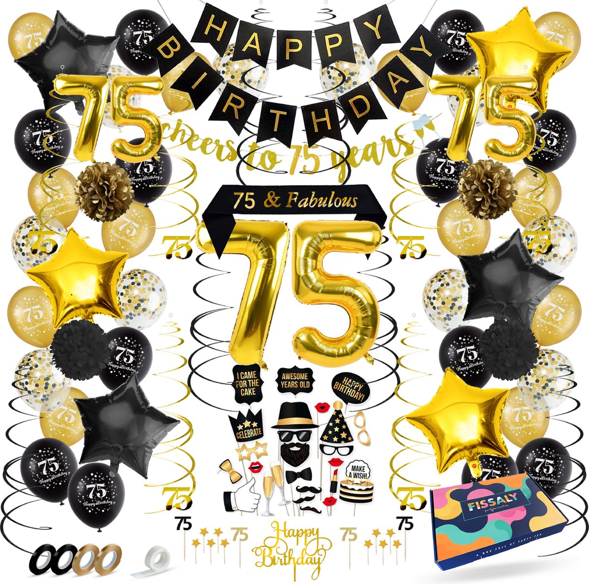 75 jaar, wat gaat de tijd toch snel! Vier dit jaar je mooie leeftijd extra goed met de unieke decoratie set van Fissaly®. In deze set zit alles inbegrepen om je verjaardag een succes te maken en een onvergetelijke dag te beleven!
