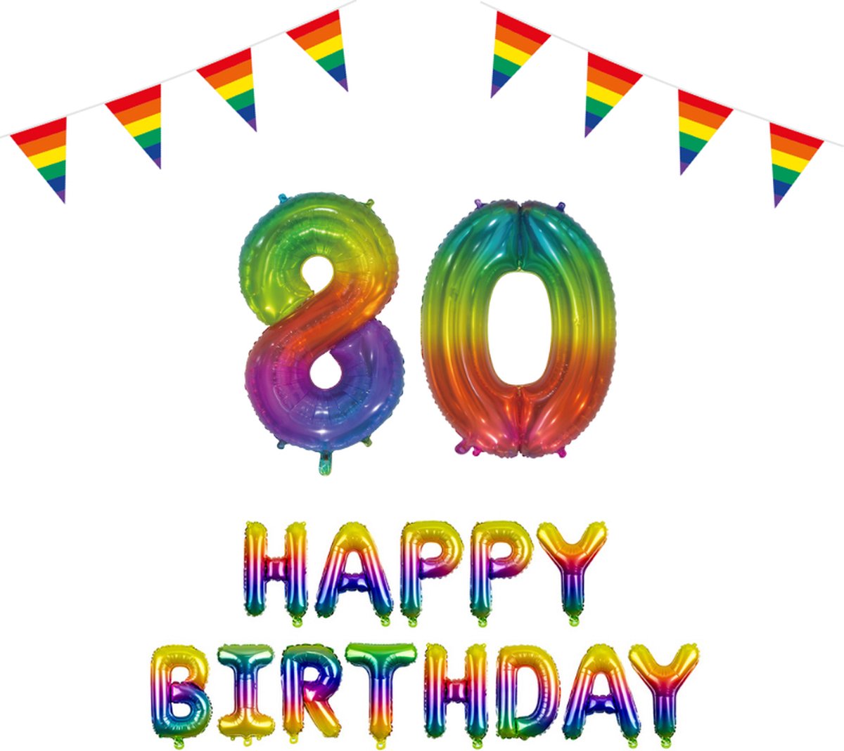 In de verpakking ontvang je cijferballonben 80 (76cm), Happy Birthday Regenboog Folieballonnen, 2 Regenboog vlaggenlijnen van 10 meter en een roze lint van 20 meter.